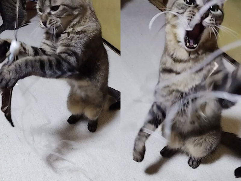 そろそろ手持ちのおもちゃは飽きてきてしまったので、CATCH ME!という台湾のメーカーで竿の先につける羽根とヤモリを購入。